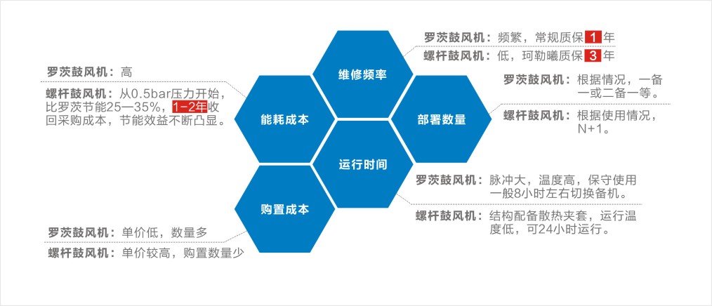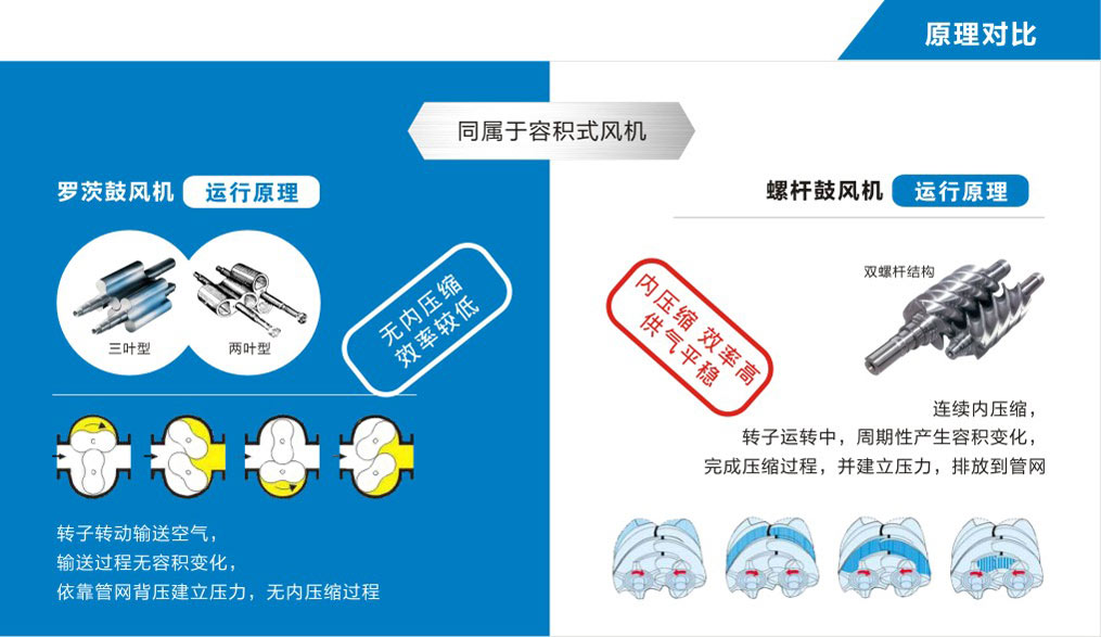 羅茨風機和螺桿鼓風機都是屬于容積式風機,如果兩者要進行比較的話,可以簡單歸結為壓縮原理的不同,螺桿鼓風機的節能、穩定、低噪優勢更為突出。